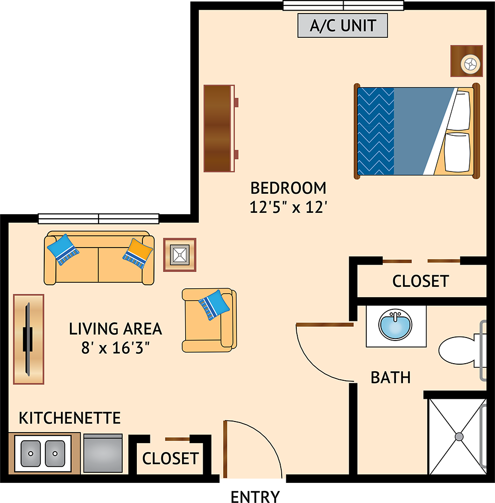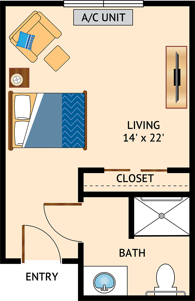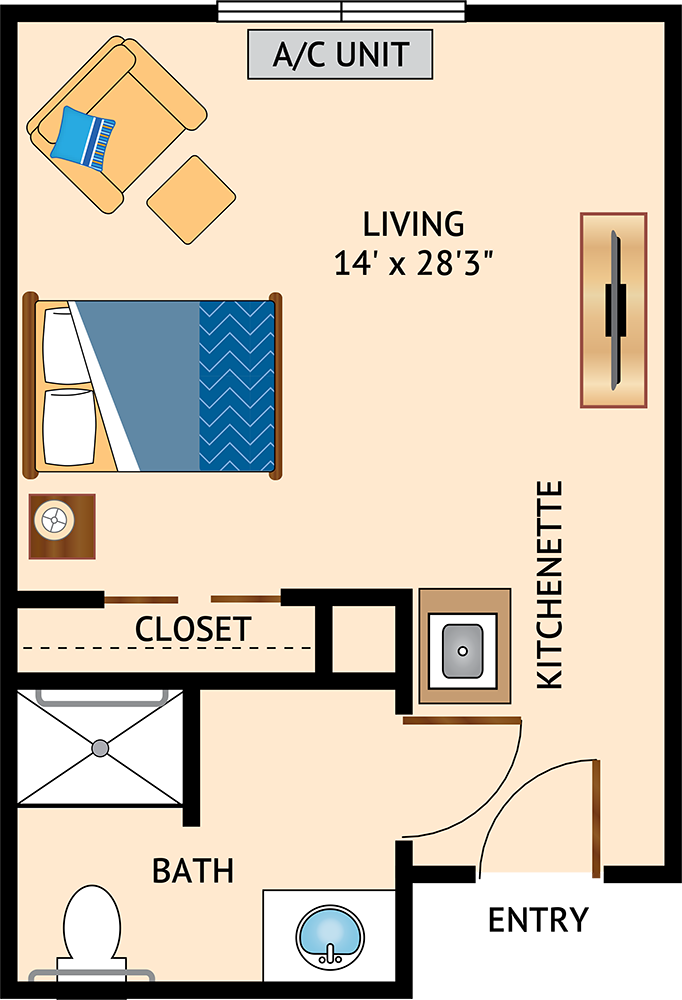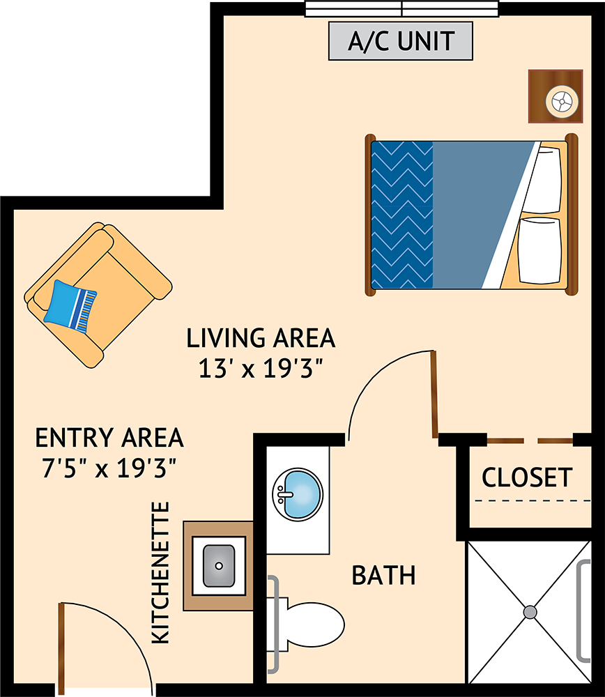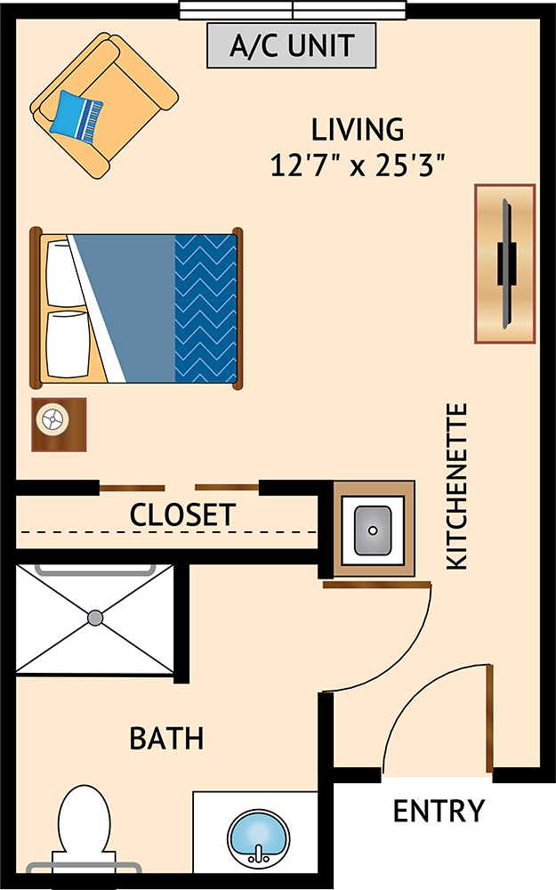 Exquisitely appointed with the finest finishes and fixtures, Broadway Cityview offers a variety of Assisted Living Studio floor plans.